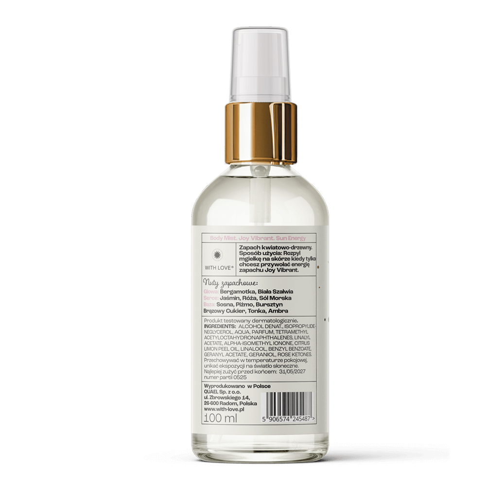 Pozwól, aby każda kropla mgiełki Joy Vibrant owinęła skórę i włosy promienną aurą pełną radości, świeżości i naturalnej harmonii. To nie tylko zapach – to doznanie zmysłowe, które budzi energię i napełnia dzień słońcem.
